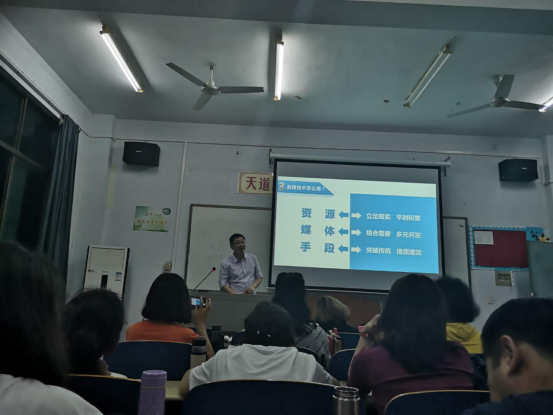 本网讯(罗江华)为了提升教师应用现代教育技术的能力,4月25日晚上7:00,公司邀请公司实验中心教师杨波,在张家界校区3506教室举行了一场主题为“教育技术在教学中应用”的讲座,公司张家界校区教师及新疆吐鲁番市第十三期少数民族国家通用语言培训班学员到场聆听。讲座由公司经理尹祝寿主持。