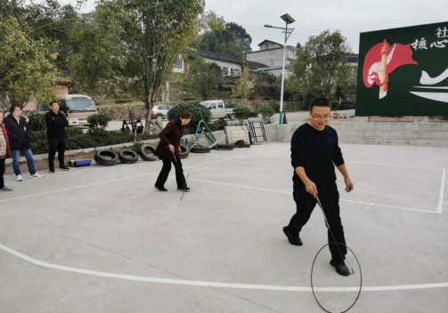 图为教职工滚铁圈活动