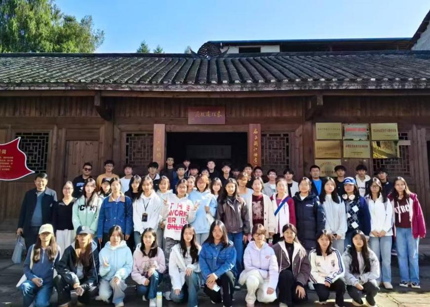 在慈利县三官寺株木岗国防教育基地,师生走进袁任远故居,斑驳的门槛、古朴的滴水床,每一处细节都承载着厚重的红色记忆。同学们凝神聆听讲解,认真记录点滴,满怀对革命先辈的崇敬之情。随后,师生一行驻足国防教育走廊与张家界飞行营地,红色历史印记与乡村振兴的现代图景在此交相辉映。在家风展板“注重人格”四字前,同学们深有感触:红色精神从来不是尘封的历史,而是可感可触、可学可践的行动指南。