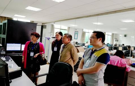 图为 罗金铭副董事长、尹祝寿经理陪同省教育厅田慧副处长(左一)、陈汉光主任(右一)巡视